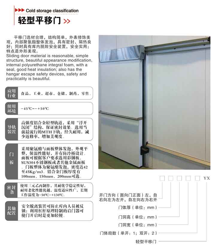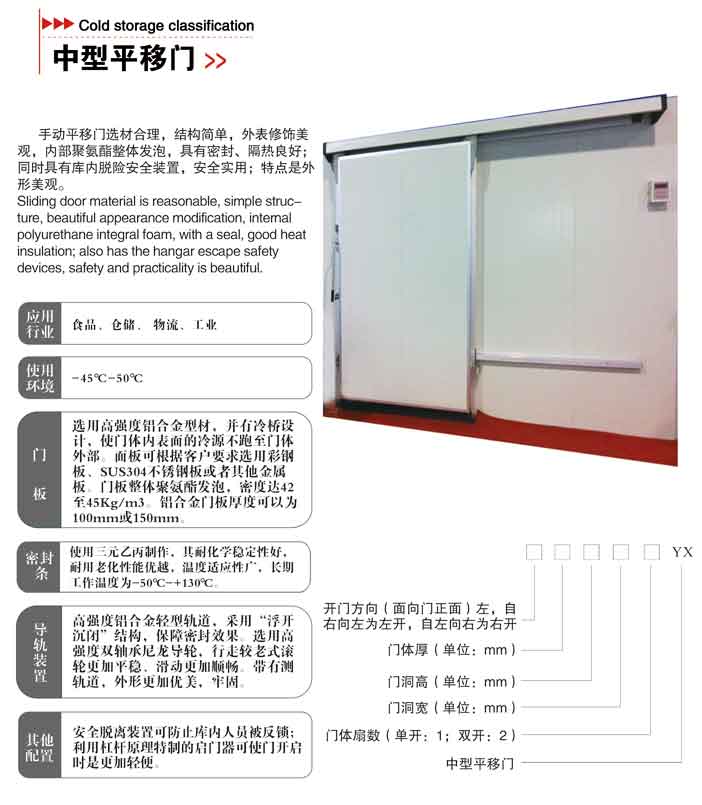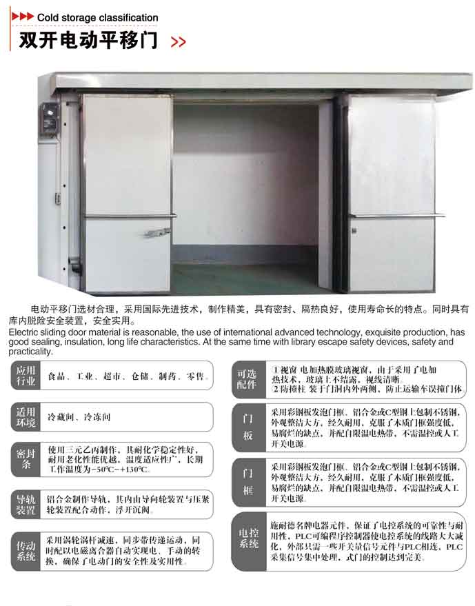 平移門選材合理,結構簡單,外表修飾美觀,內部聚氨酯整體發泡,具有密封、隔熱良好;同時具有庫內脫險安全裝置,安全實用;特點是外形美觀。